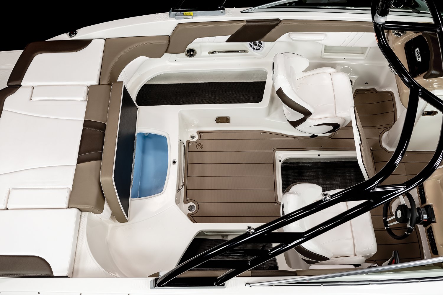 • Cockpit Layout: Two Bucket Seats (Slide and Swivel) with Logo Badging, U-Shaped Seating and Aft Hinged Sundeck with Walk-Thru and Lounge Position