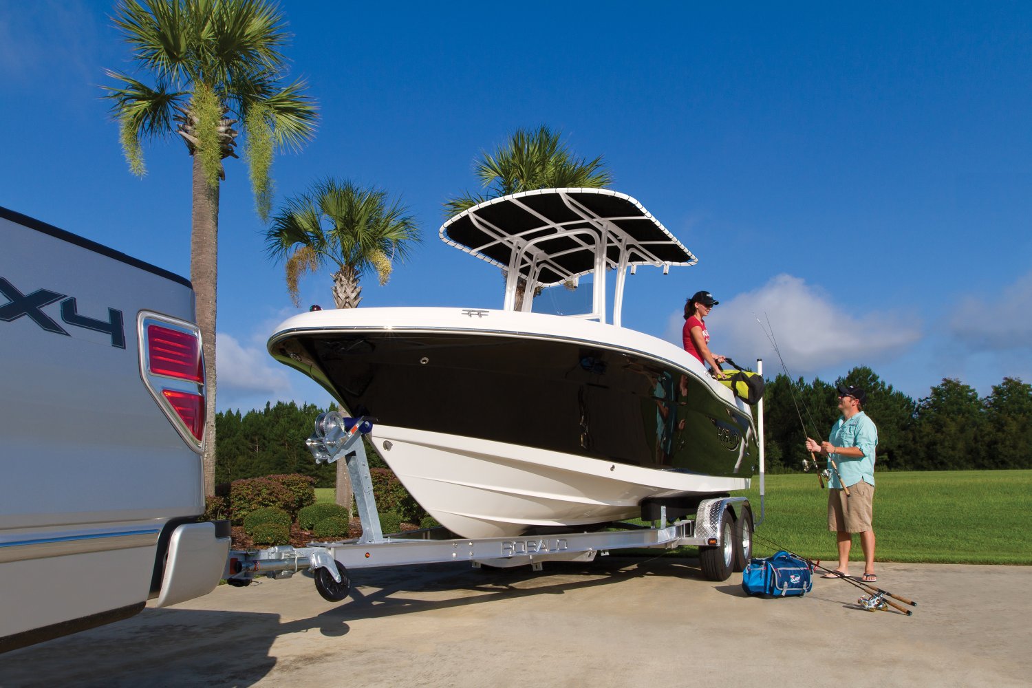 Aft Jump Seats with Folding Backrests and Custom Aluminum Hardware (Converts to Casting Platform) Aluminum Tandem Axle Trailer Includes: Tandem Axle, Disc Brakes on all Four Wheels, Folding Tongue Jack, 14" Galvanized Wheels, LED Lights - Submersible, Winch Stand with Safety Straps, Swing-Away Tongue, Trailer Side Guides