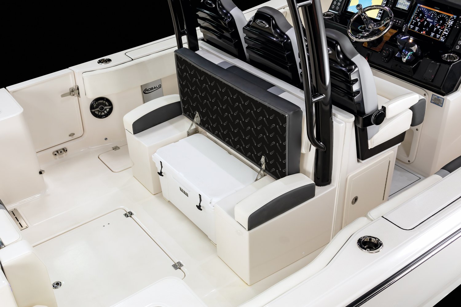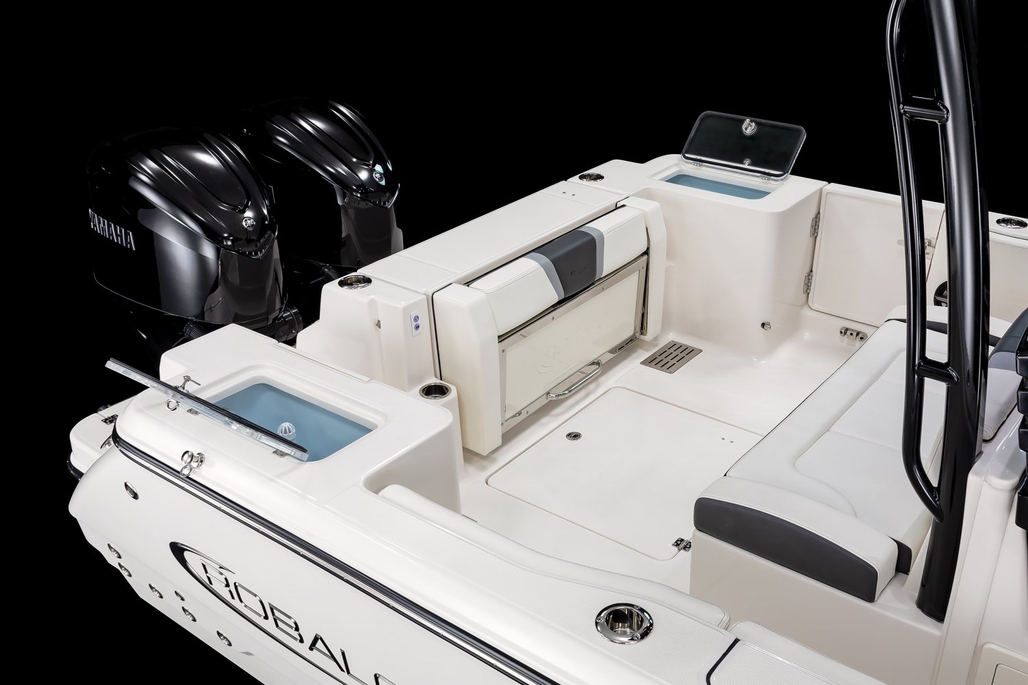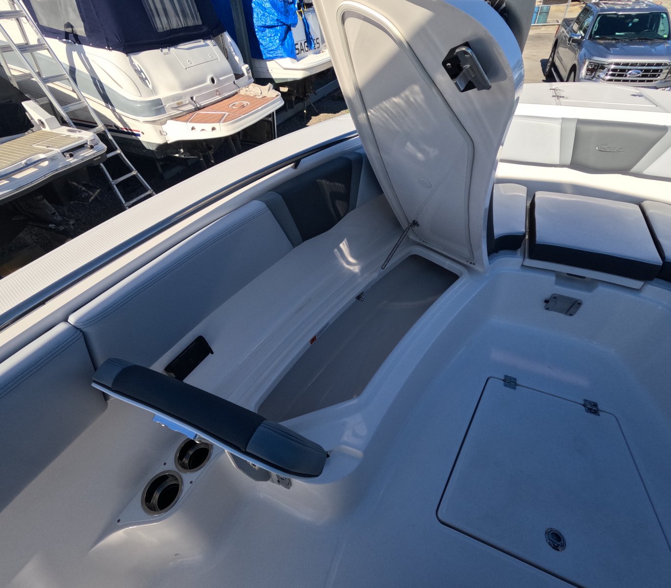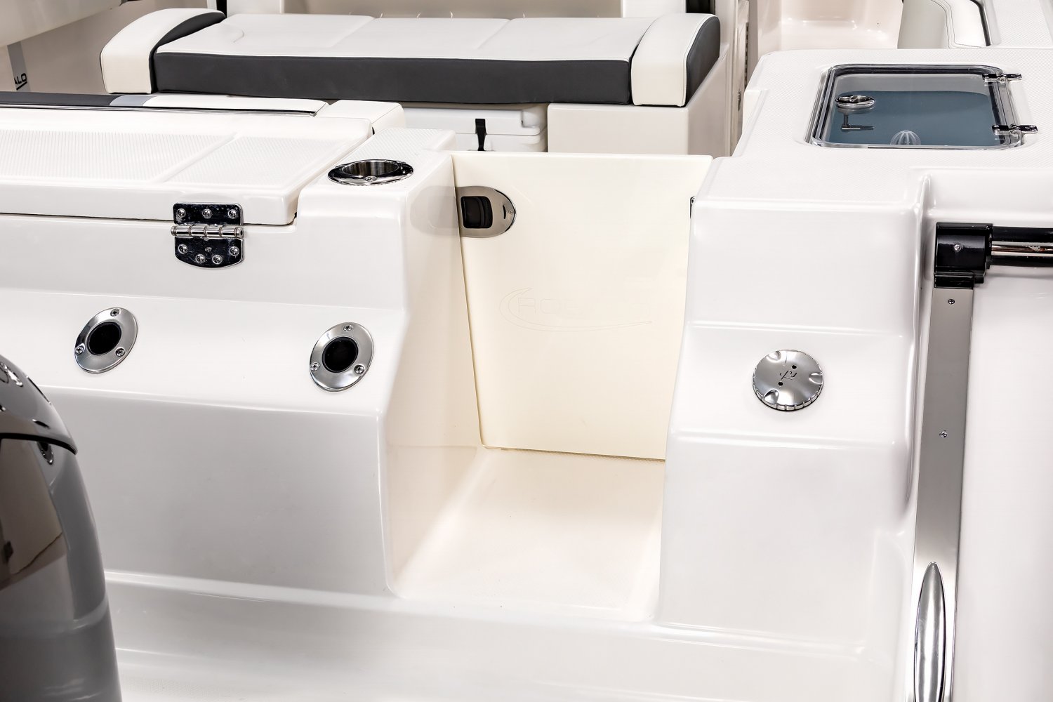 • Aft Facing Bench Seat with Stainless Steel Drink Holders and Carry On 65 Qt Yeti Cooler