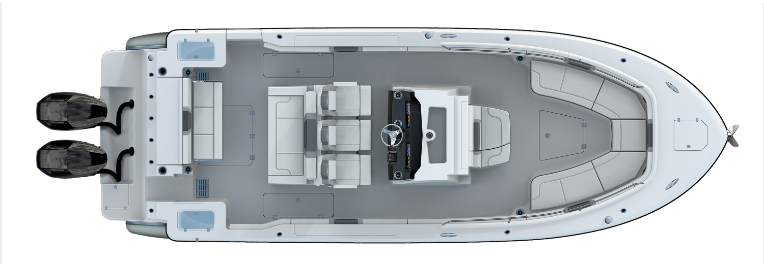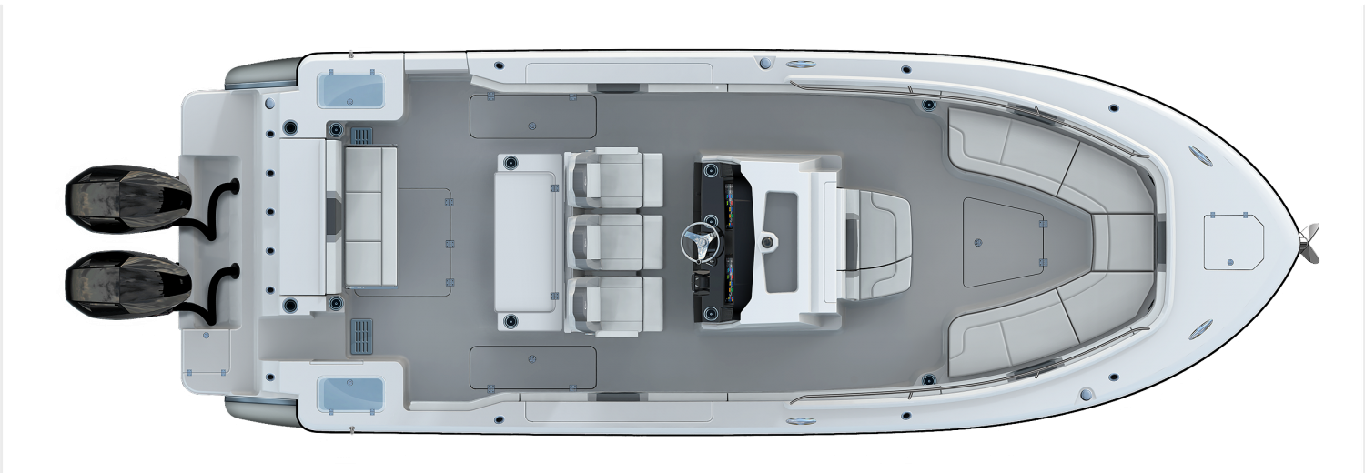 • Triple Forward Facing Helm Seats w/ Flip-Up Bolsters and Fold Down Armrests (Includes Center Seat Electric Forward/Aft Control)