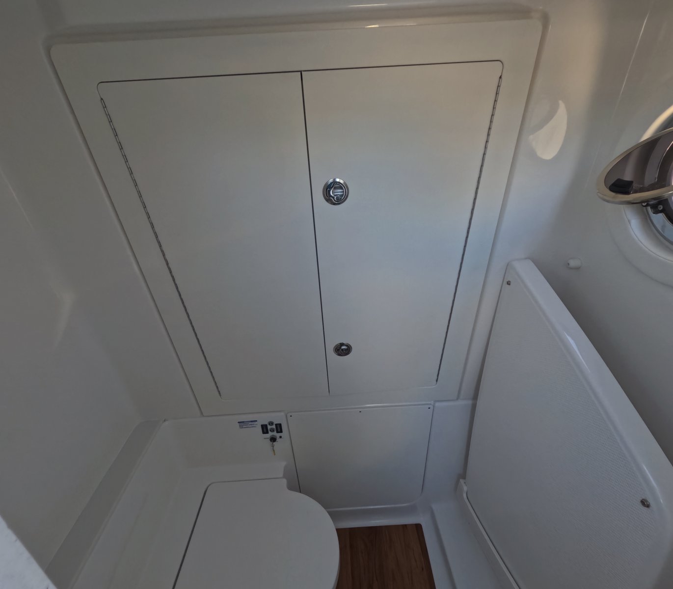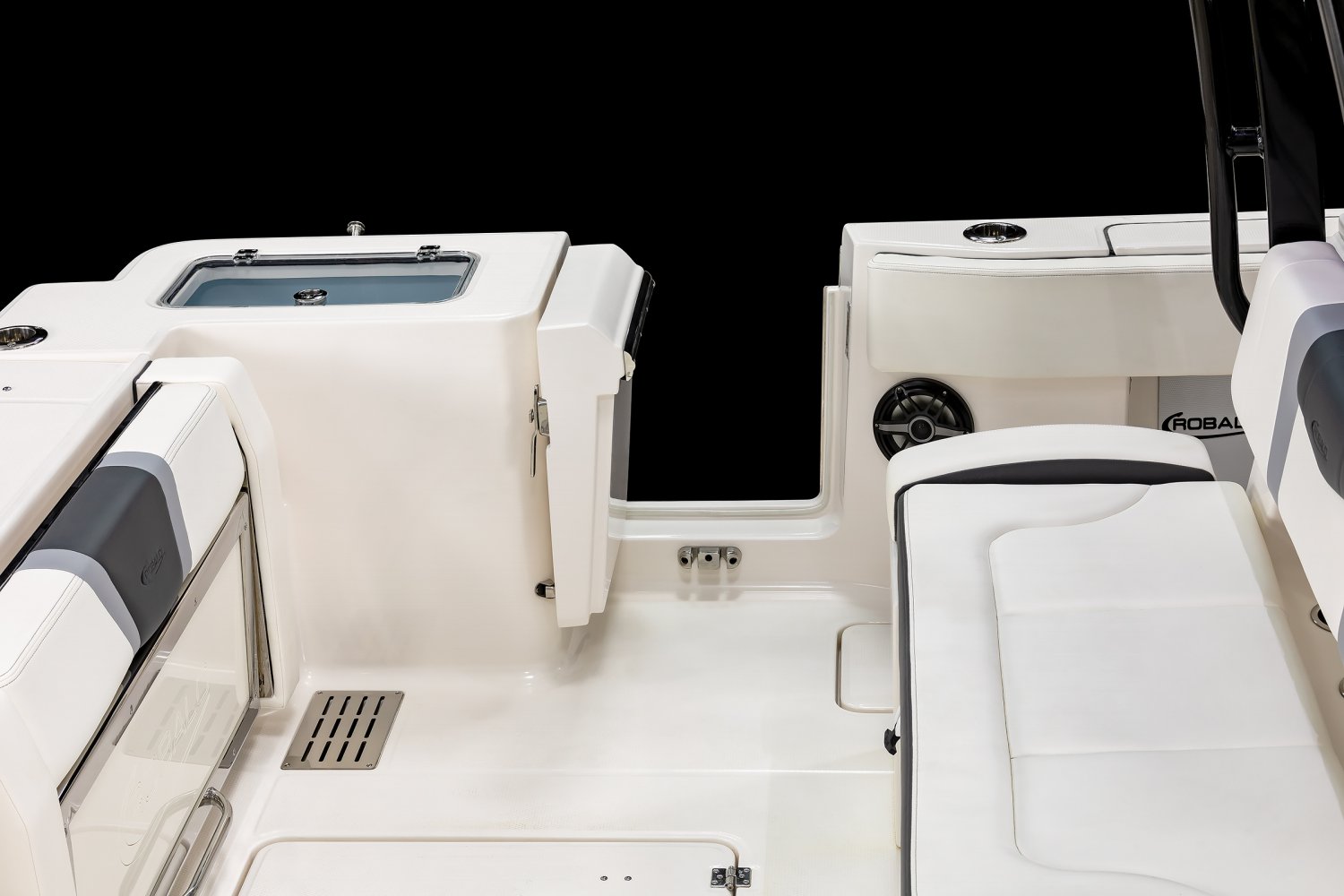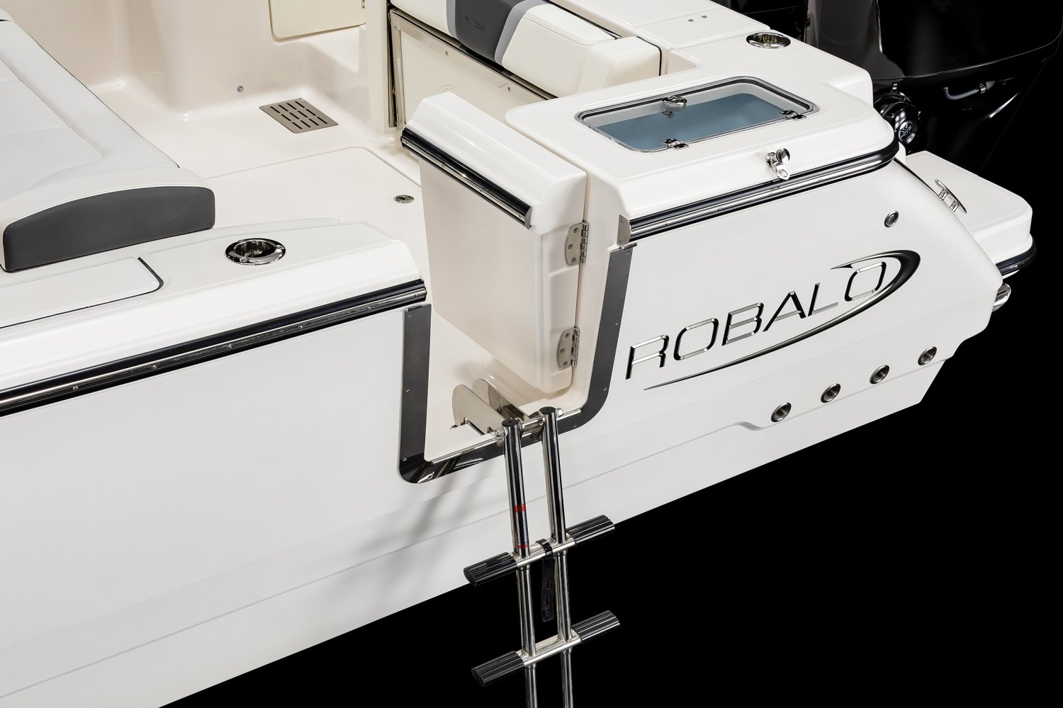 • Fiberglass Hardtop with Custom Powder Coated Frame (Black or White) Includes: Overhead Sky Light, Rod Holders (8), Electronics Box, Tri Color Map Lights (4), Spreader Lights with Dual Color (White and Blue - Dimmable) (5), Blue Overhead Courtesy Lighting, Speakers (2), Fresh Water Washdown Shower, and LED Cast Robalo Logo