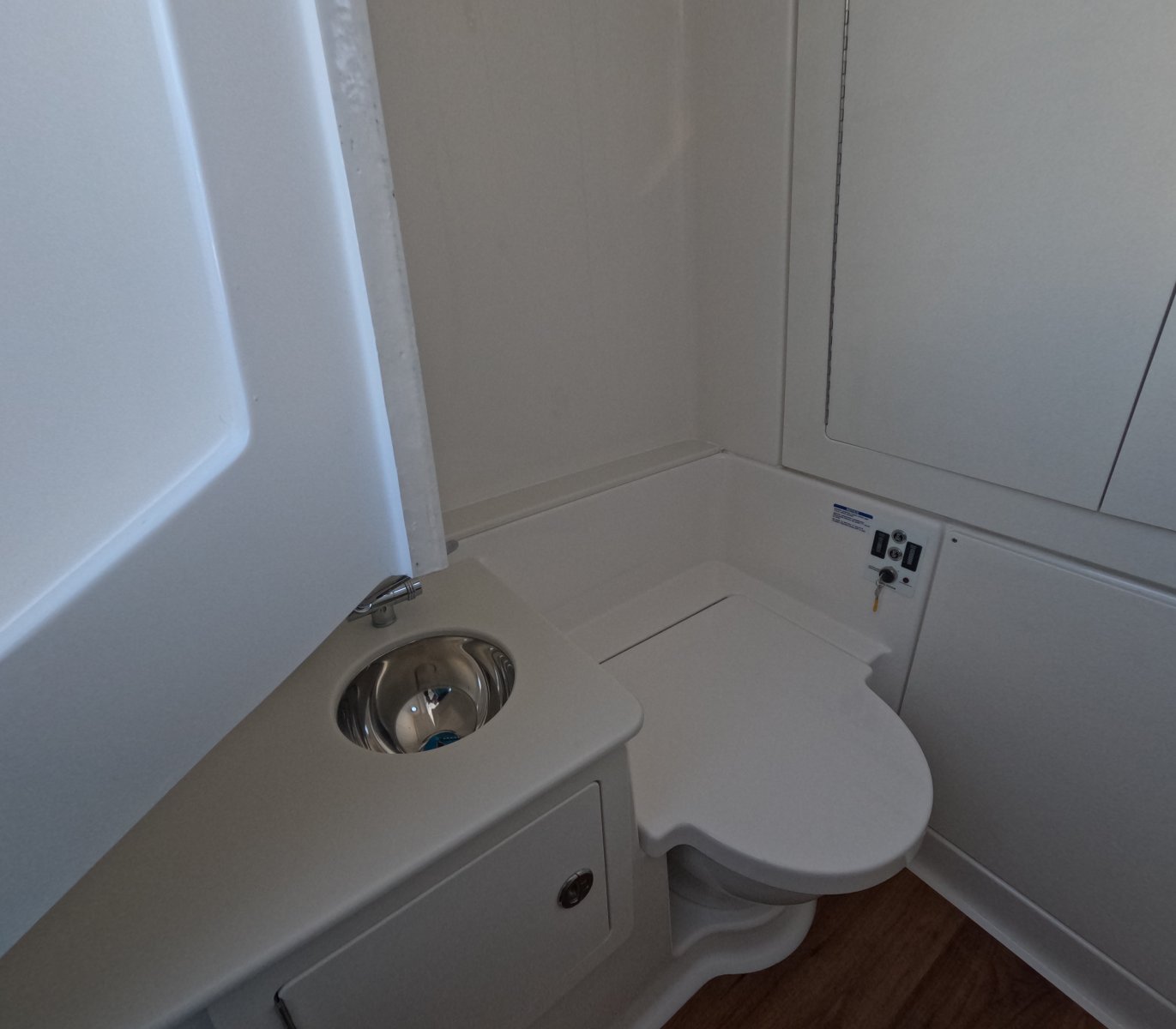 • Head Vanity Includes: Solid Surface Top, Stainless Steel Sink, Faucet, Lower Cabinet Storage, and Sump Pump