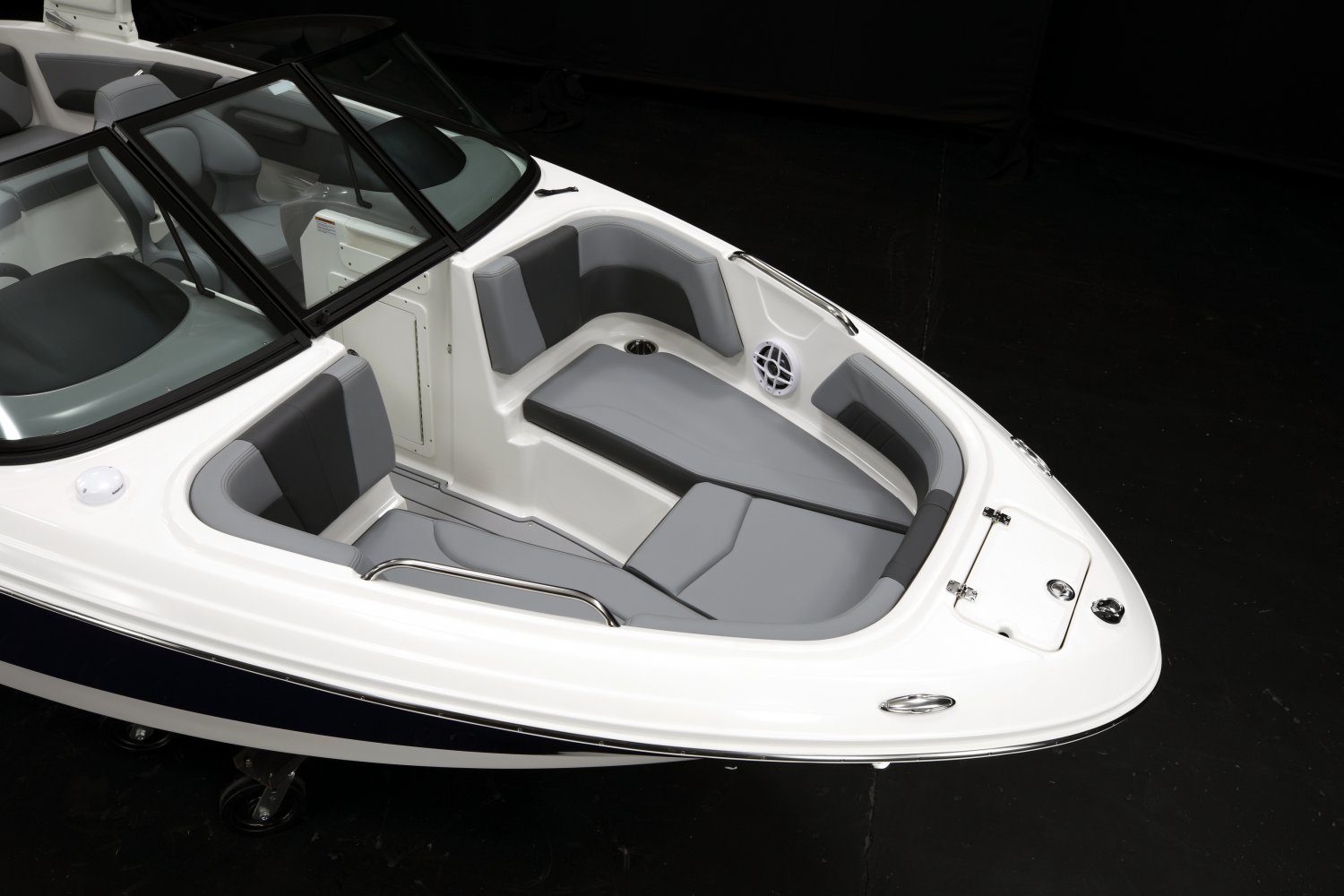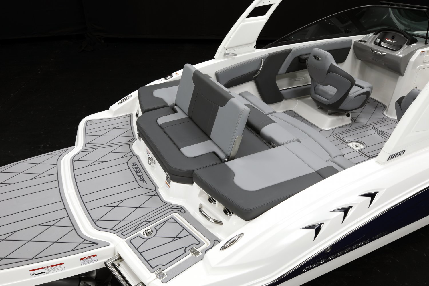 Cockpit Layout: Two Bucket Seats (Slide and Swivel) with Logo Badging, Rear Bench Seat and Aft Hinged Sundeck with Walk-Thru, Lounge Position and Aft Facing Seat