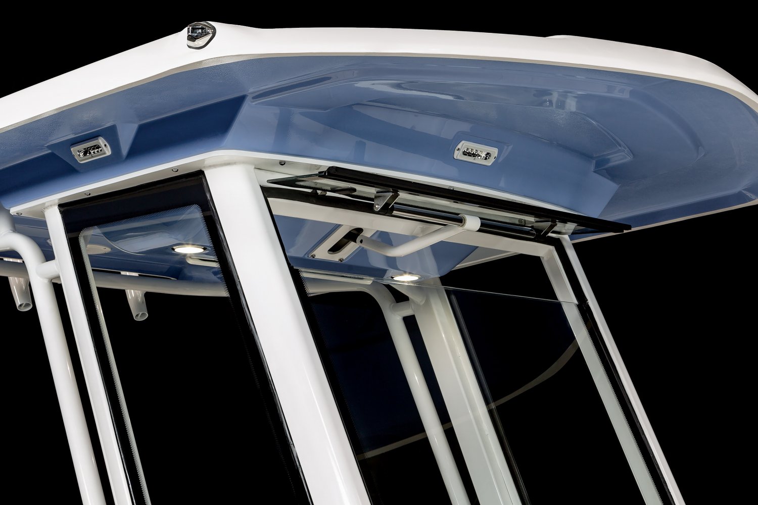 Fiberglass Hardtop with Custom Powder Coated Frame (Black or White) Includes: Electronics Box, Two Tri-Color Map Lights (White Dimmable, Red, and Blue), Spreader Lights with Dual Color (White and Blue Dimmable)