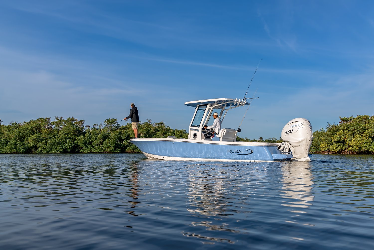 Hull Side Gelcoat - Atlas Blue Yamaha Four Stroke White 450HP 30" with Digital Electric Steering Cockpit Interior - Harbor Mist Canvas Color - Black (If Equipped) Canvas Accessories Color - Black (If Equipped) Standard Hard Top Complete (Powder Coated - White) Forward Canvas Fly - White Canvas Twin Garmin GPSMap 1243XSV Garmin NMEA 2000 Package with Engine Data and Audio Interface - Yamaha Engine Garmin VHF Radio JL Audio Sound System Upgrade Dual Color LED Underwater Lights (2 each) Lenco Pro Trim Tab System Seadek Helm Mat - White Overboard Discharge Stainless Steel Drink/Rod Holders (4) Deluxe Leaning Post - SS Drink Holders (2), and Teak Panel Tool Holders and Arm Rest - White Custom Anchor Power Pole Blade - 10FT - Port and Starboard - Black Prep Fee 5 Year Premium Level Limited Component Warranty Tandem Axle Aluminum Trailer with Galvanized Wheels, Side Guides and Bow V-Stop Bow Ladder 4-Step with Grab Rails - Aluminum