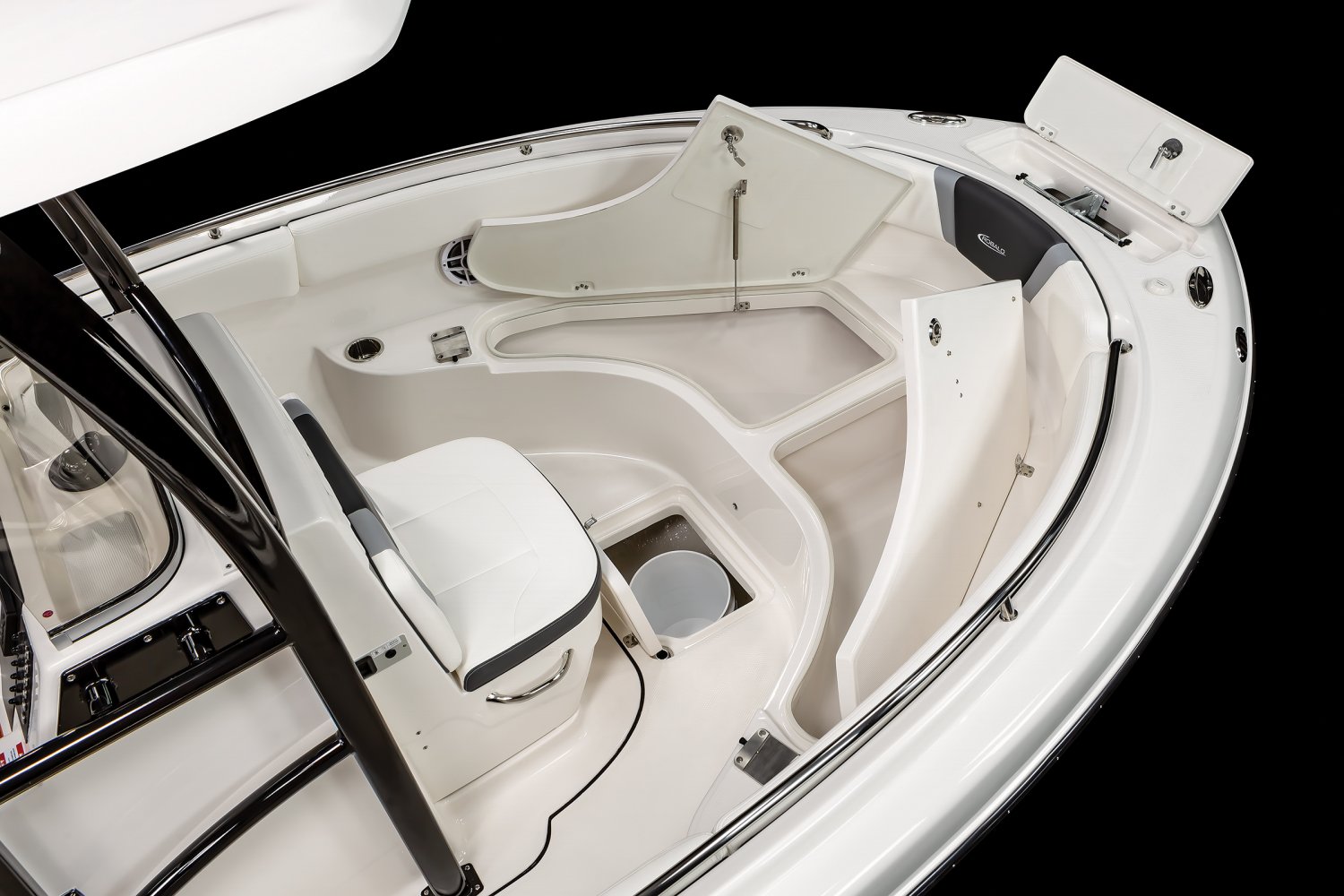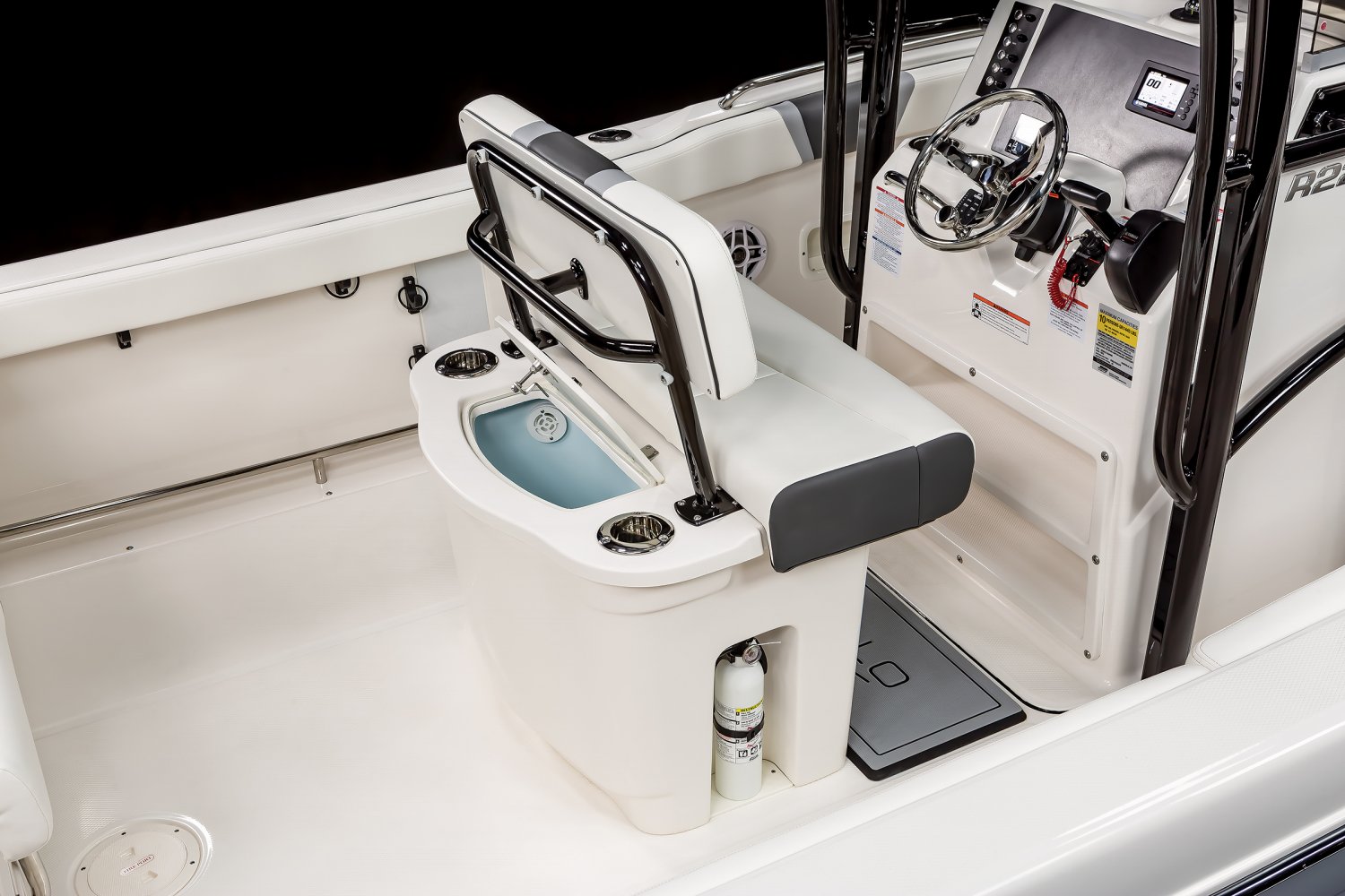 It had to happen. Parlaying the game-changing success of the R180 and the R200, Robalo takes its center console offerings up a notch with the introduction of the new R222. The R222 is sold at a nationally advertised price. The keyword here is more. More centerline length. More storage space. More ride comfort. More seaworthiness. More fishing features. The only place where the new R222 proudly comes up short is its Reel Deal price tag. Key fishing features include twin 30-gallon fish boxes that can either keep your catch fresh or serve as storage areas. A 15-gallon livewell with LED lighting and a blue gelcoat finish is conveniently positioned under the standard leaning post.