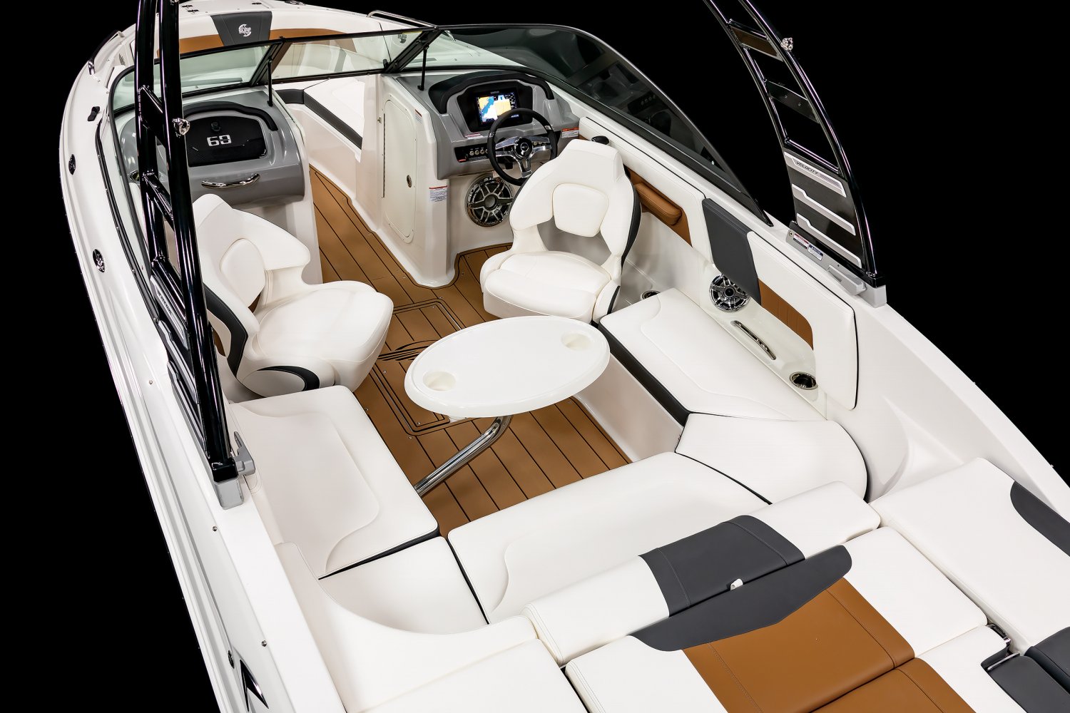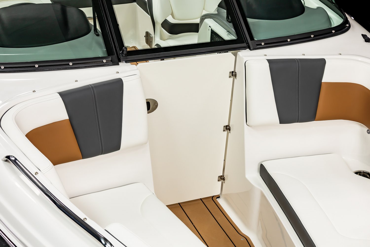 Cockpit Layout: Two Bucket Seats (Slide and Swivel) with Logo Badging, U-Shaped Seating and Aft Hinged Sundeck with Walk-Thru, Lounge Position and Aft Facing Seat