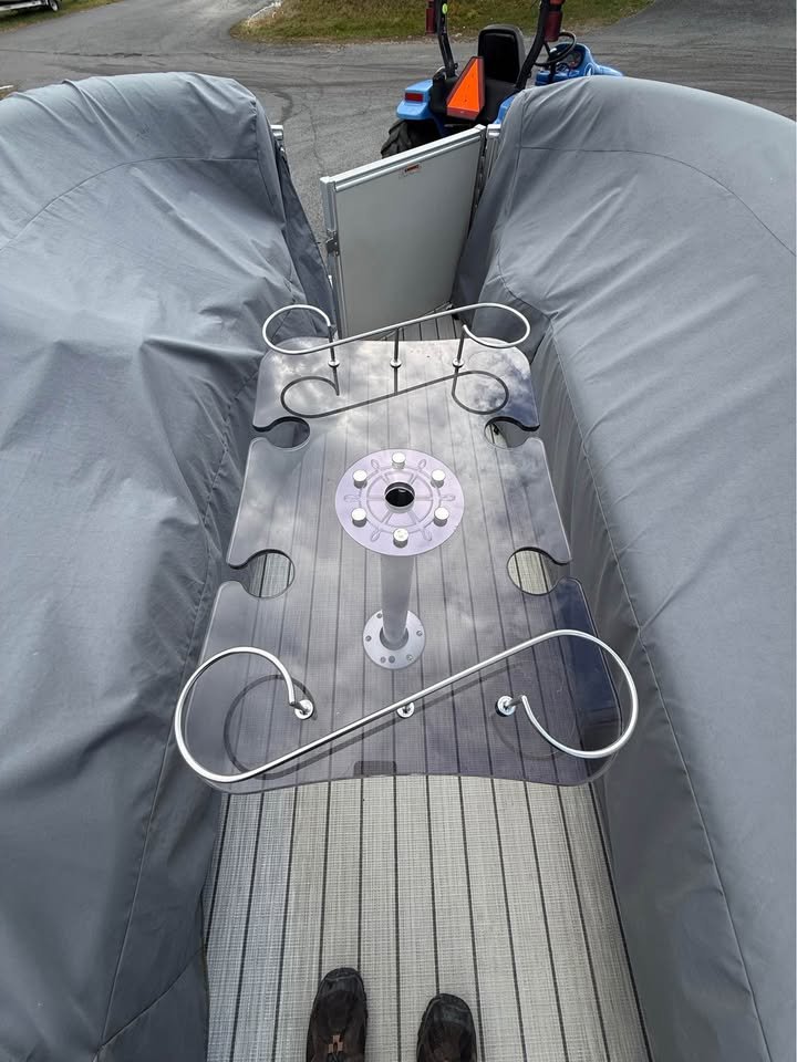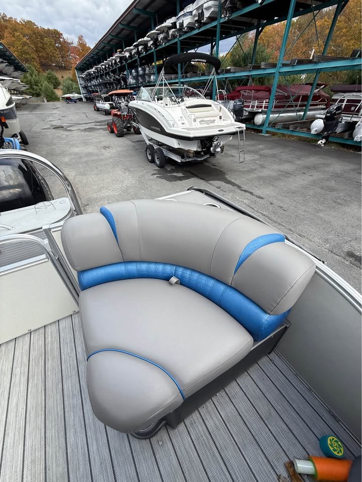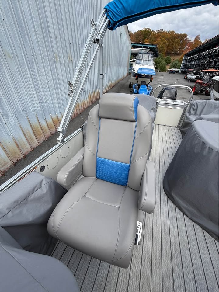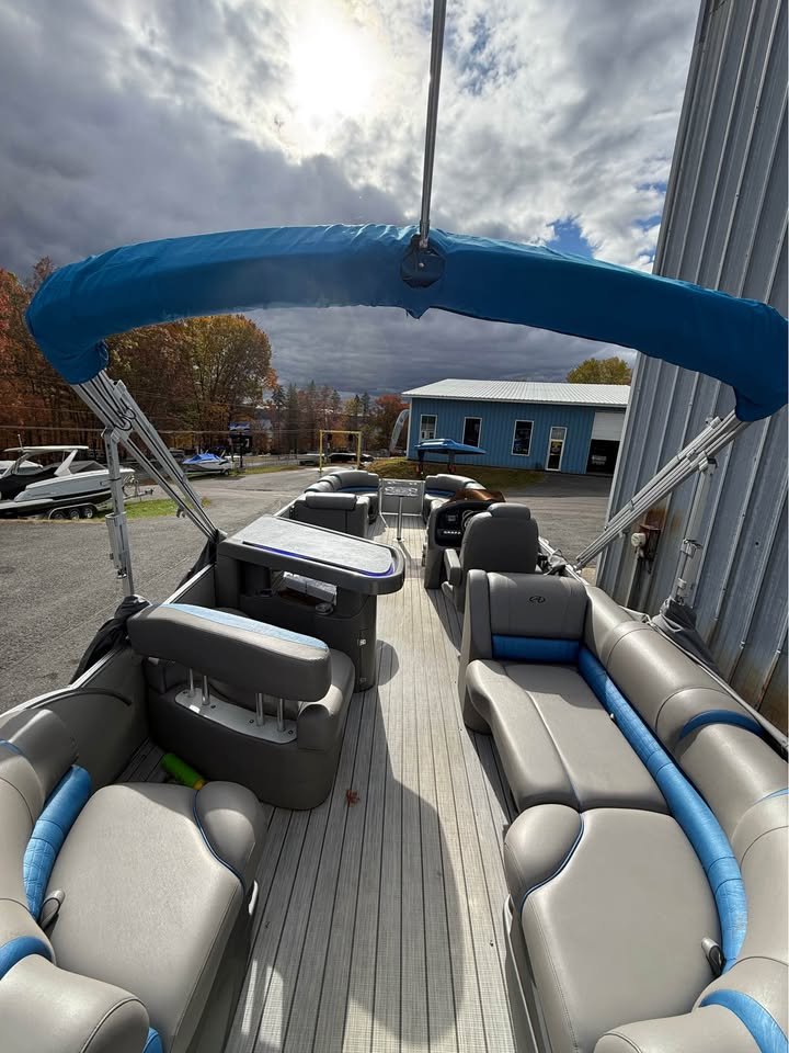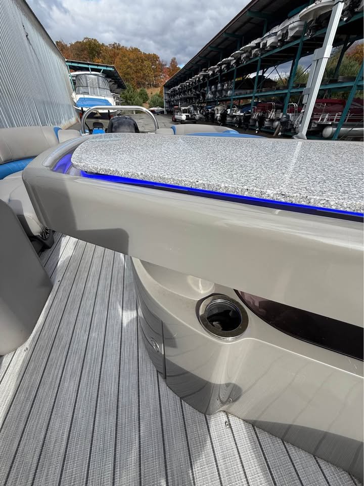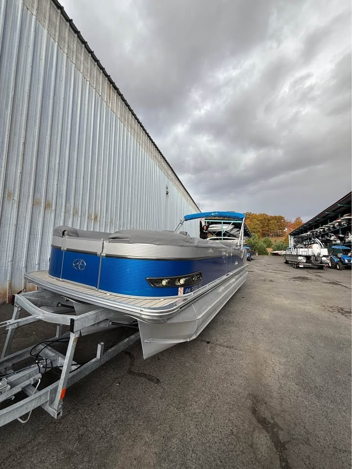 2021 Avalon Catalina Platinum Entertainer tritoon , Mercury 350 Verado Digital Throttle and Shift, only 174 hours of fresh water use, this 27’ tritoon is loaded with upgrades. 6 lifting fins, power steering, lighted speakers and cupholders, 6 speakers, sub and amplifier, custom seat covers, dual batteries, high performance Waveglider package, 19 person capacity. Indoor winter storage included. LEDS lit speakers and mood lights, custom boot w stool layout, drop down cleats, deco dock lights, power steering, 10' Bimini top, Avalon components covered through 2031, lifetime deck warranty. Side impact Keels, Bottom protective keels, Ski tow, Under deck sheeting, changing room, aluminum seat frames, ultrafine vinyl upgrade, polished stainless corner caps, gps/chartplotter.