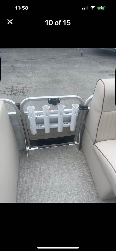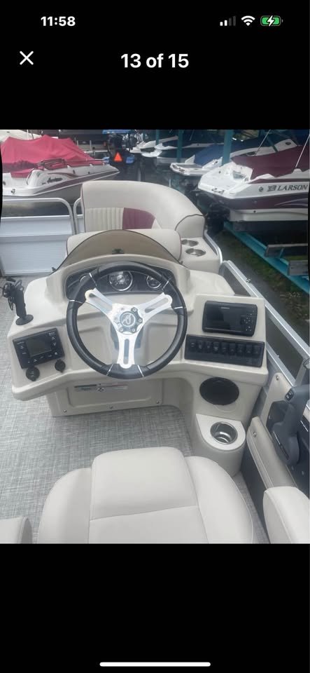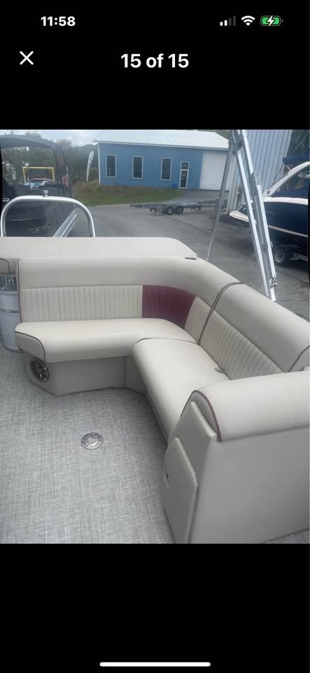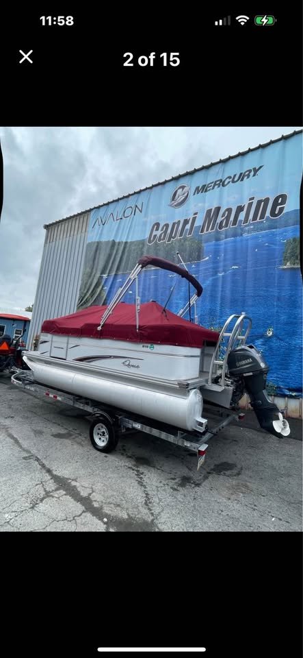 2022 Qwest 816 Luxury Series Pontoon, (17’) powered by Yamaha 50 HP motor with 80 hours. Features battery on/off switch, trolling motor pre wire, infinity 4 speaker stereo upgrade, vinyl flooring, ski tow bar, Bimini top, high back reckoning captains chair, docking lights, drop down cleats, playpen cover, Garmin fish finder, tilt steering, cockpit table, new trailer available at additional cost, warranty included, financing available